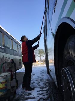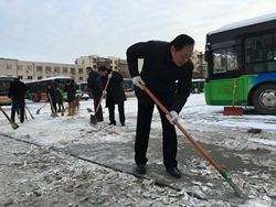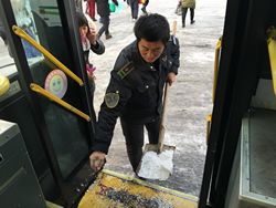 5點,分公司、路隊兩級管理人員全部按照分工,到達指定線路、樞紐站,開始協(xié)助司機加水、熱車,做好發(fā)車前的準備。6點半,總公司、分公司機關管理人員開始清掃站點積雪;客流集中的各大站點,管理人員已經(jīng)在疏導乘客,指揮車輛進出站。初冬的凌晨溫度最低,冷風直透心底。上午9點多,當直播五十分和唐山交通臺的記者趕到遠洋城站點采訪時,一公司的管理人員已在此堅守了四個多小時。大雪讓車身結(jié)了厚厚的一層冰和泥,保潔員們用工具一點一點艱難地清理著。