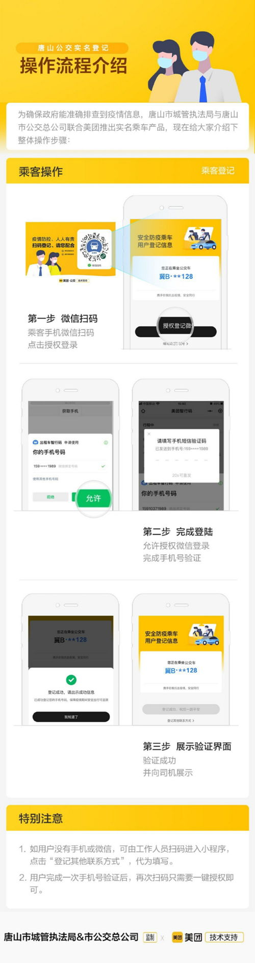 該實名制登記系統(tǒng)是唐山市城管執(zhí)法局、唐山公交總公司與美團公交合作開發(fā),已覆蓋所有公交車,實現(xiàn)了“一車一碼”。登記的相關信息使用專用服務器予以加密保存,既杜絕了登記信息泄露的風險,又可有效減少因手工登記帶來的接觸風險。在此倡議乘客朋友積極配合、文明乘車,有序排隊掃碼登記,請予理解和支持。