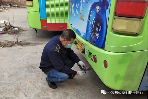 3月22日一大早,伴隨著“轟轟”的發(fā)動機聲,118路司機竇玉海將韓城李莊子車場內(nèi)停駛的30部公交車一一“喚醒”。“車輛長期停駛,電瓶容易虧電,會導(dǎo)致車輛打不著火,所以隔幾天就要啟動一次。”啟動完車輛后,竇玉海又馬不停蹄地對車輛技術(shù)狀況、車載安全設(shè)施正常使用情況進行了認認真真的逐車檢查。一通忙碌下來將近三個小時,此時他又踱步在場區(qū)的角角落落開始了消殺工作。