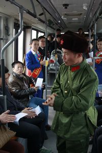 活動現(xiàn)場,公交志愿者扮演成“現(xiàn)代雷鋒”,上車唱響了雷鋒歌曲,乘客們在志愿者的帶動下也參與到其中。唱歌的同時,志愿者們還向車內(nèi)每位乘客發(fā)放學(xué)雷鋒宣傳單。參與活動的市民反映稱:他們“偶遇”這次活動,感覺別具意義。市民張先生說:“這種傳播正能量的“作秀”多些又何妨?讓更多有需要的人得到更多的幫助,就是在用行動傳播正能量……”