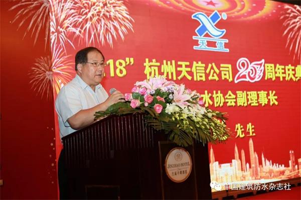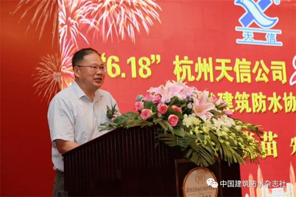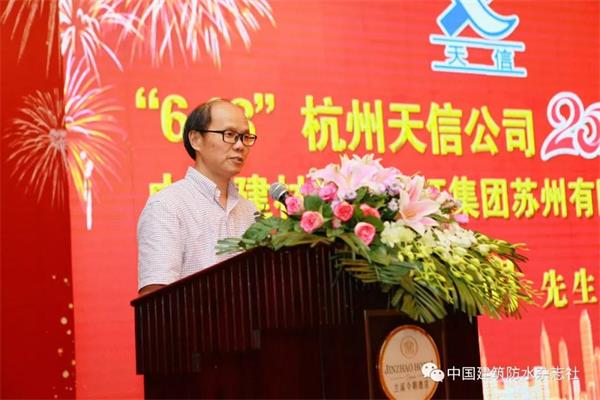 中國建筑材料科學研究總院蘇州防水研究院巢文革院長致辭,對天信公司二十周年慶典表示祝賀。他說,通過20年的發(fā)展,天信已成為產(chǎn)品品種齊全、注重系統(tǒng)的區(qū)域性防水龍頭企業(yè);他表示,愿發(fā)揮科研服務機構的優(yōu)勢,在新產(chǎn)品新技術研發(fā)、裝備升級、技術標準、科技出版與傳播、家裝防水服務平臺等方面與天信公司加強合作,助力天信公司進一步發(fā)展壯大。他指出,在目前防水行業(yè)競爭加劇的新形勢下,希望天信公司繼續(xù)做好產(chǎn)品、施工、應用及服務,再上臺階,再創(chuàng)輝煌。