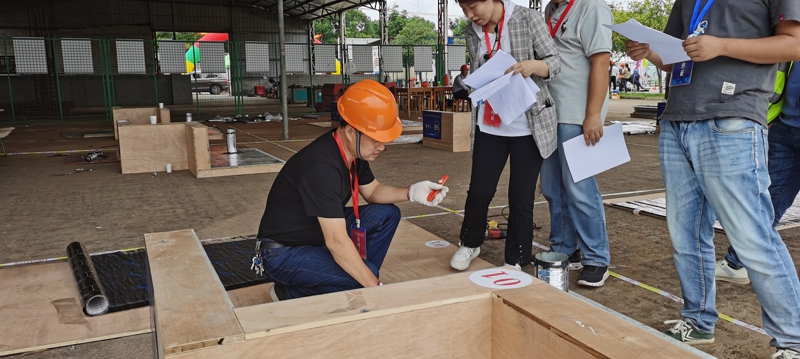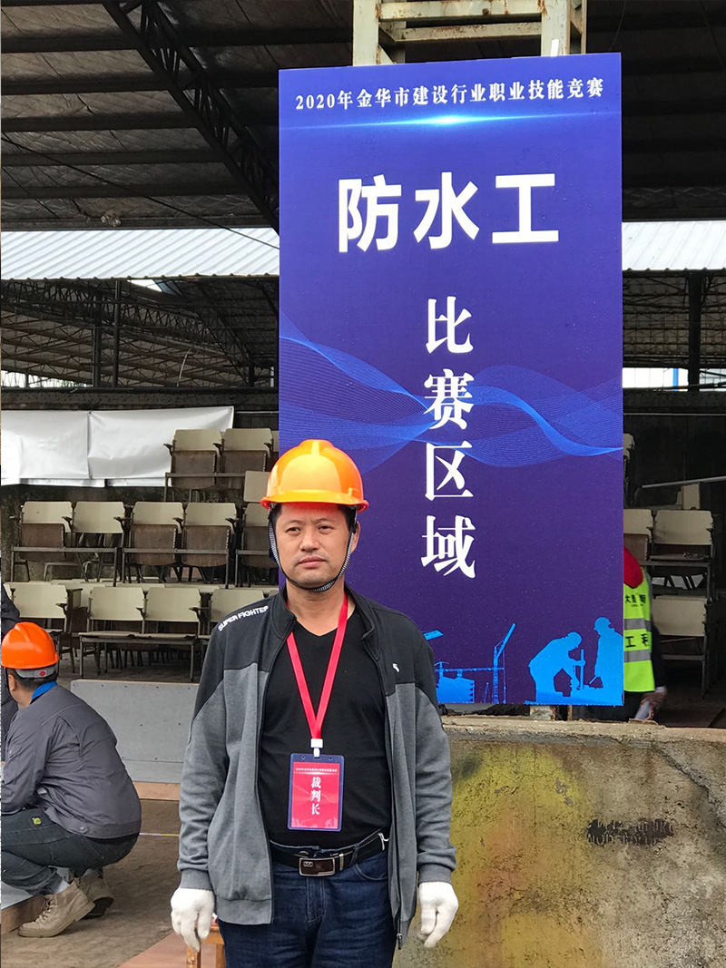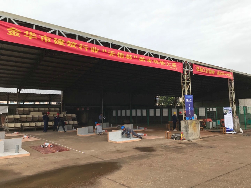 本次競賽為金華市百項職工職業(yè)技能競賽,屬地區(qū)級一類競賽。競賽工種有:架子工、防水工、混凝土工、建筑塔式起重司機。全市由各縣(市、區(qū))、施工總承包特級企業(yè)選送8個團隊參加各個工種比賽。其中,冠名為“天信杯”的建筑防水工種競賽也有8支隊伍參加。競賽分別以筆試與實操二個內(nèi)容進行。整個競賽尤其是實際操作比賽緊張激烈、精彩紛呈,集中表現(xiàn)了建筑防水人的精湛技能,和顯現(xiàn)了比出水平、比出風格、比出防水人的精氣神。實際操作競賽由屢次榮獲國家級、省級防水技能大賽榮譽,公司工程部盧建通部長受邀擔任裁判長。